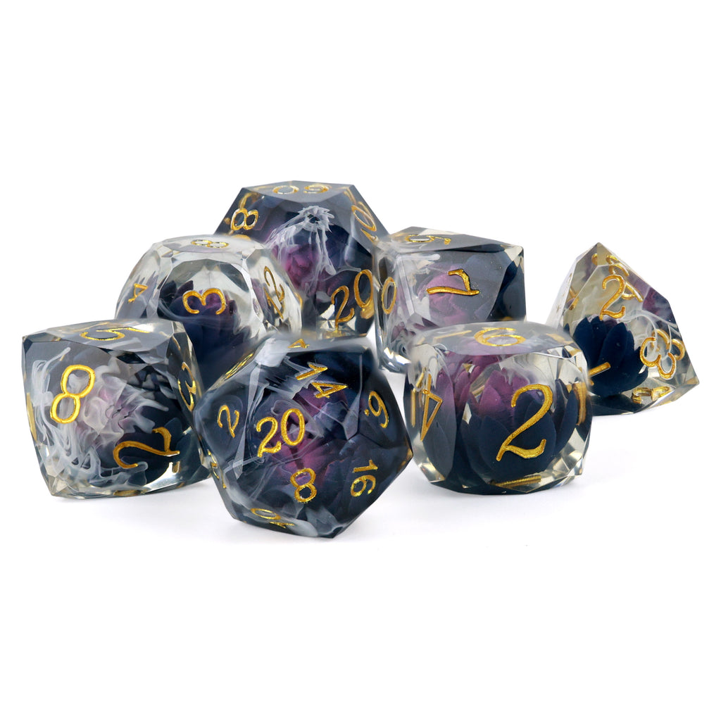 Each die in this set is handcrafted from crystal-clear resin, with a model of a black lotus bloom suspended within.