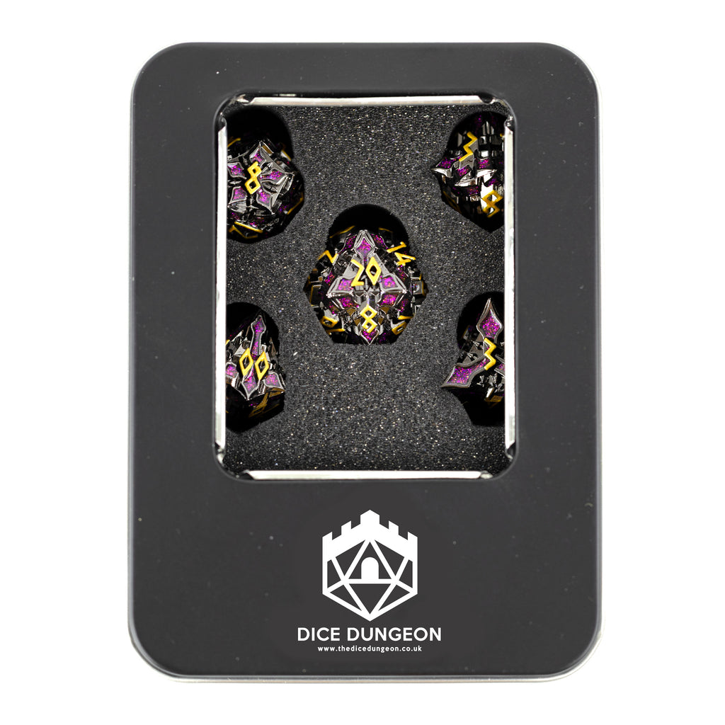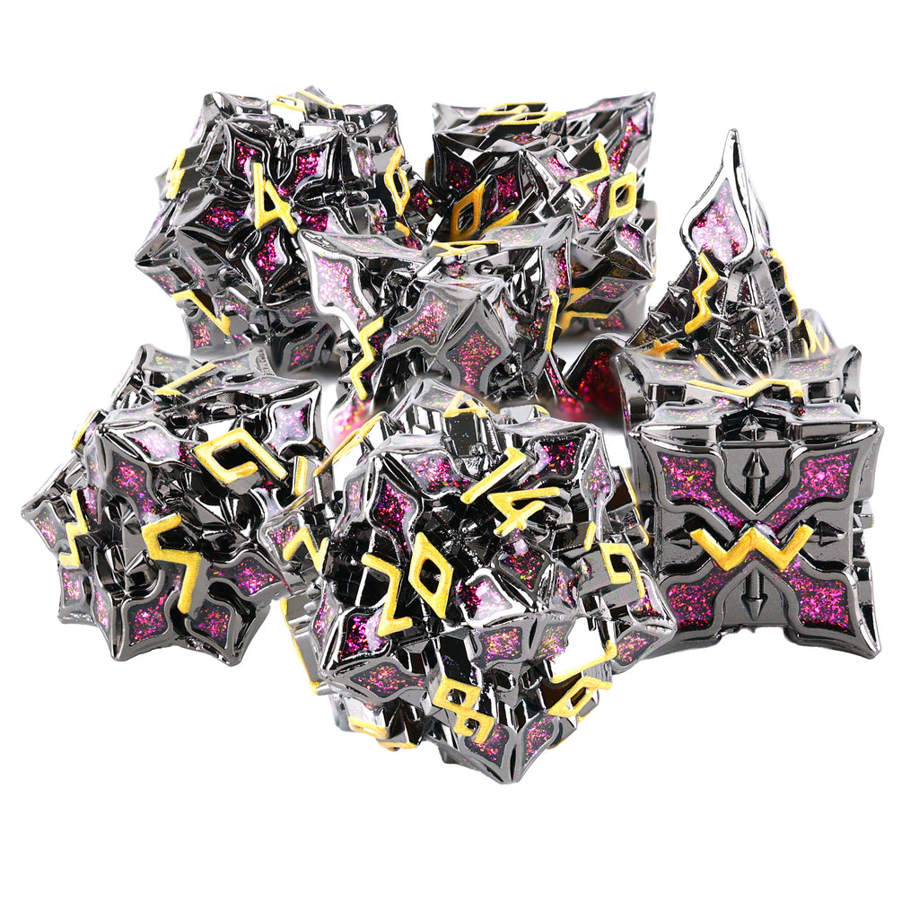 Crystalline Nova is a 7-piece metal dice set finished in polished silver with deep red glitter set into a celestial lattice of star-shaped cutouts. Each die combines weighty craftsmanship with integrated, stylized numbering that flows with the design. The rich red inlay flashes like solar flares as dice tumble, creating dramatic, show-stopping rolls for Dungeons & Dragons and other tabletop RPGs.