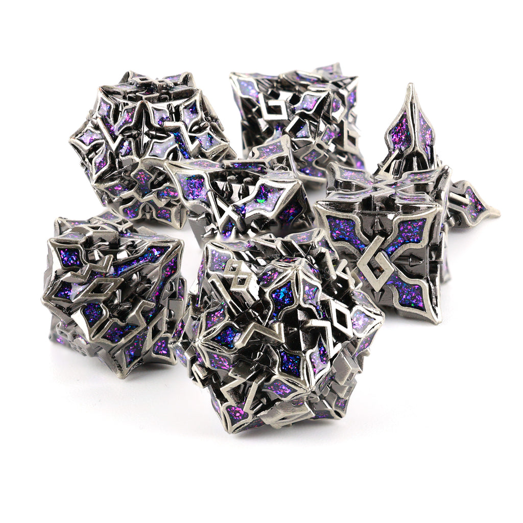 Forged from solid metal with a lustrous silver finish, the Crystalline Space set blends precision engineering with cosmic artistry. Each of the seven dice features an openwork lattice of star-shaped cutouts filled with shimmering purple glitter enamel that catches light like distant nebulae. Numbers are integrated into the geometry so every roll looks like a shard of the heavens in motion.