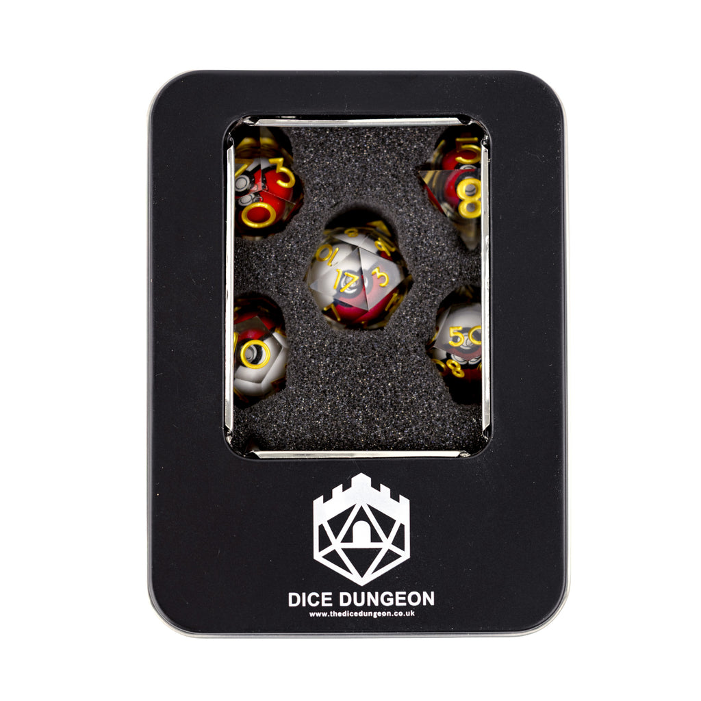 Each 7 piece set contains one D20, D12, D10, D8, D6, D4 and percentile dice.