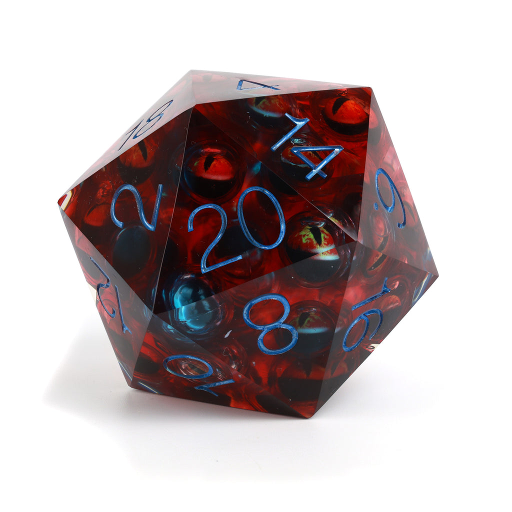 Make every roll legendary with the Supersized 80mm: Liquid Core – The Watcher Red, a colossal statement piece for true dice enthusiasts. This massive d20 features a mesmerizing liquid core with detailed eyeballs suspended within, swirling hypnotically as it moves. Encased in a deep, transparent red shell with vivid blue numbering, it commands attention from the moment it hits the table. Whether displayed as a collector’s centerpiece or rolled for dramatic effect, The Watcher is the ultimate showstopper—because sometimes, bigger really is better.