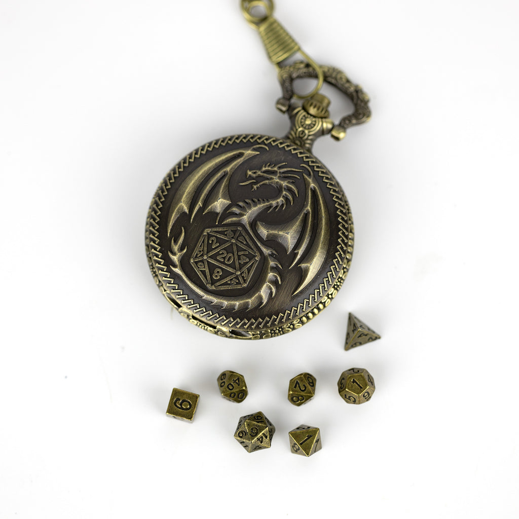 Open the token and you’ll find a complete set of mini metal dice hidden safely within the casing. Compact, durable, and satisfying to roll, these dice are ready for every moment of triumph, danger, and destiny at your gaming table. The pocket watch design keeps them protected while making it easy to carry your luck with you wherever your adventures lead.
