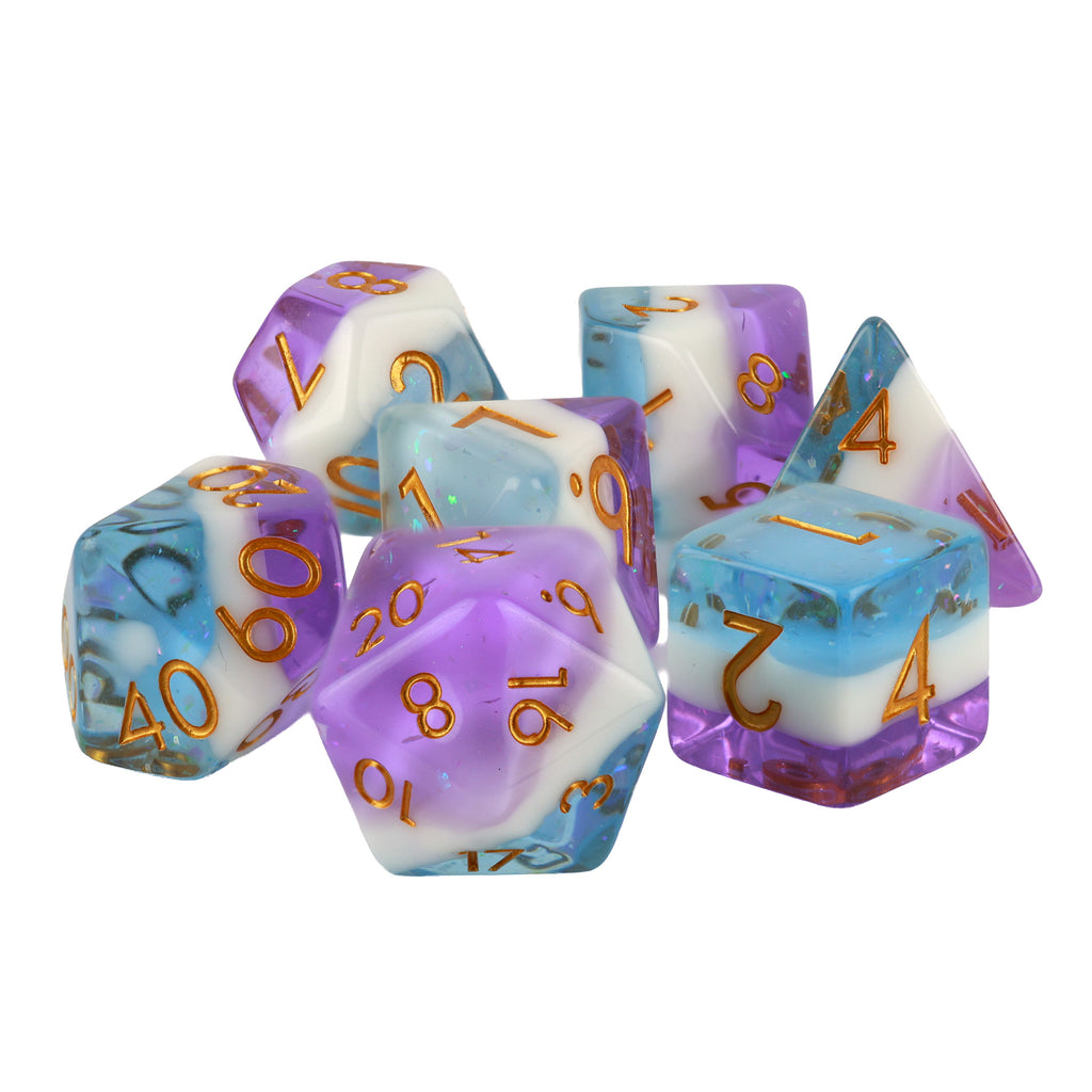 The Trans-Formation Dice Set celebrates change, identity, and self-discovery — a harmonious blend of light blue, white, and soft purple, layered like a banner of hope and strength. Each die is semi-translucent, glowing with a quiet confidence that reminds every adventurer: becoming who you are is the greatest magic of all. Perfect for players who want their rolls to reflect the beauty of transformation, both in-game and out.